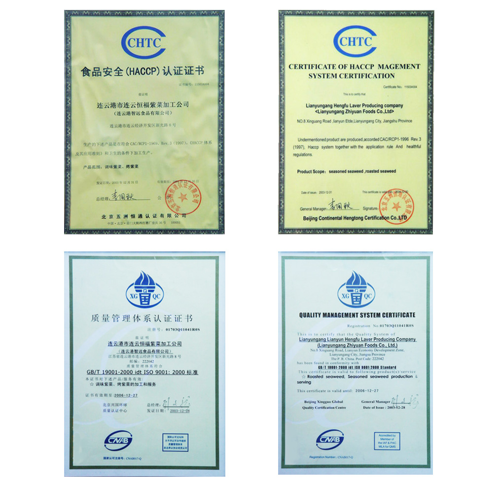 本公司通过ISO-9001:2000质量管理体系认证,建立完善的HACCP控制体系,所产"和洲屋"牌紫菜产品被江苏省消费者协会评定为2003年度推荐的放心食品,2003-2004年度推荐商品,"熊猫"图形商标被连云港市工商局认定为市知名商标,"熊猫"商标系列产品享誉海内外。本公司所产海苔主要销往日本、美国、泰国、新加坡、香港等国家和地区。